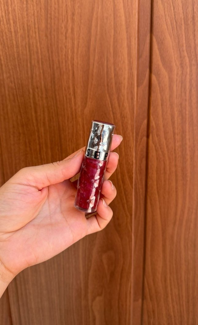 Parlak kapaklı, canlı ve parlak bordo renkte dudak parlatıcısı