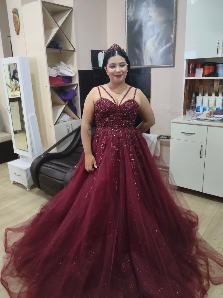 Parlak Bordo Straplez Uzun Abiye Elbise