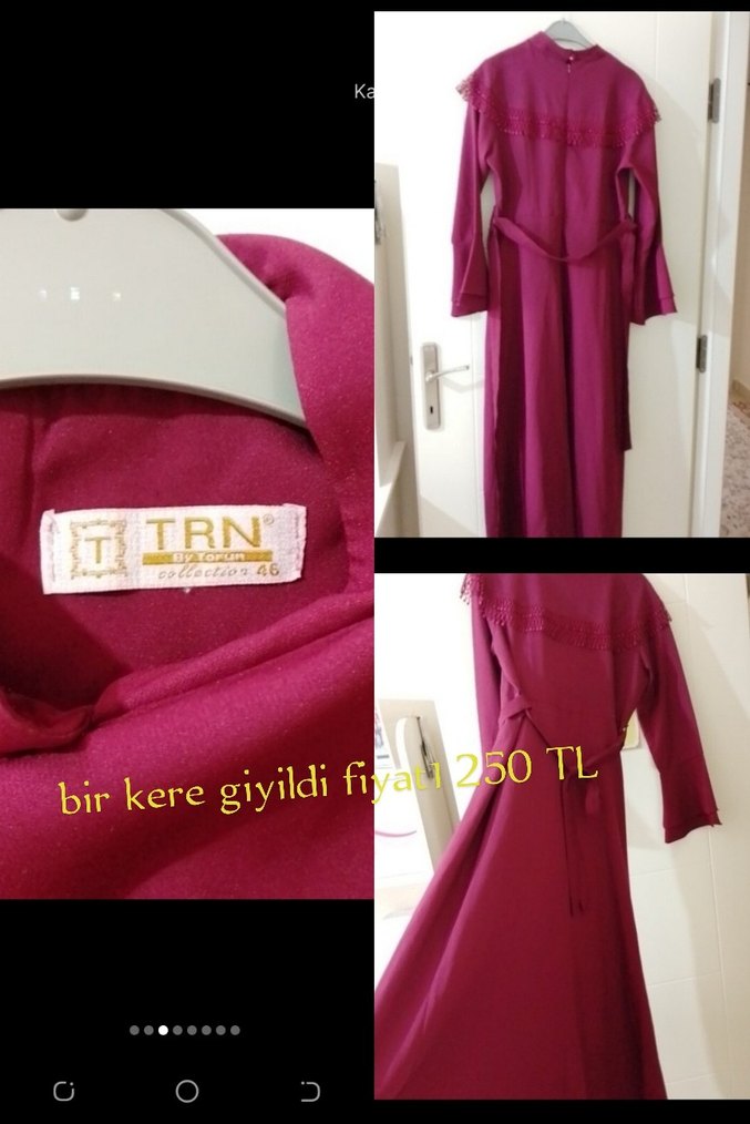 Parlak dokulu, borda renkli, uzun kollu, bol kesim kadın elbisesi. İş ortamına uygun, klasik tarzda ve baskılı desene sahip. Bir kere giyildi, fiyatı 1.250 TL.
