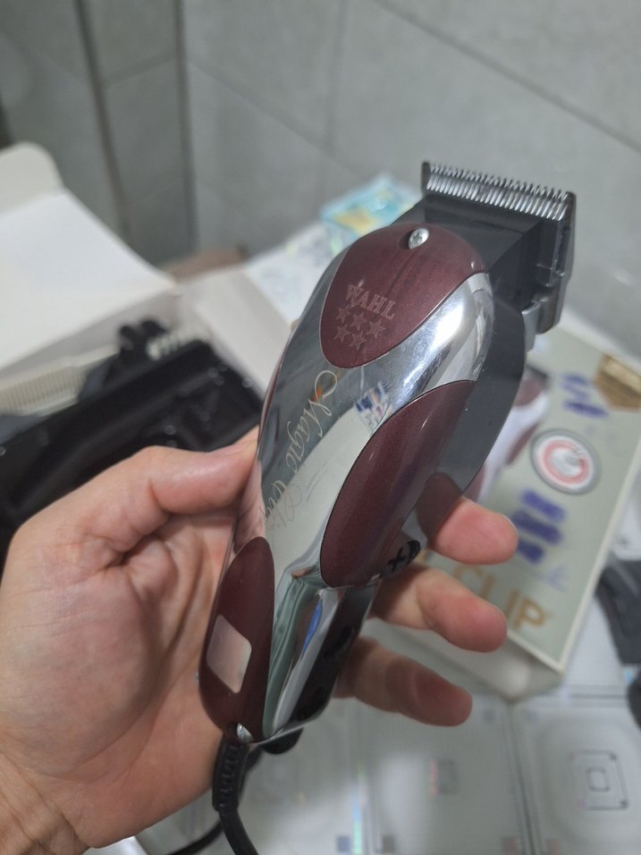 Parlak bordo renkte Wahl saç kesme makinesi, rahat tutuş ve hassas kesim sağlar ✂️.