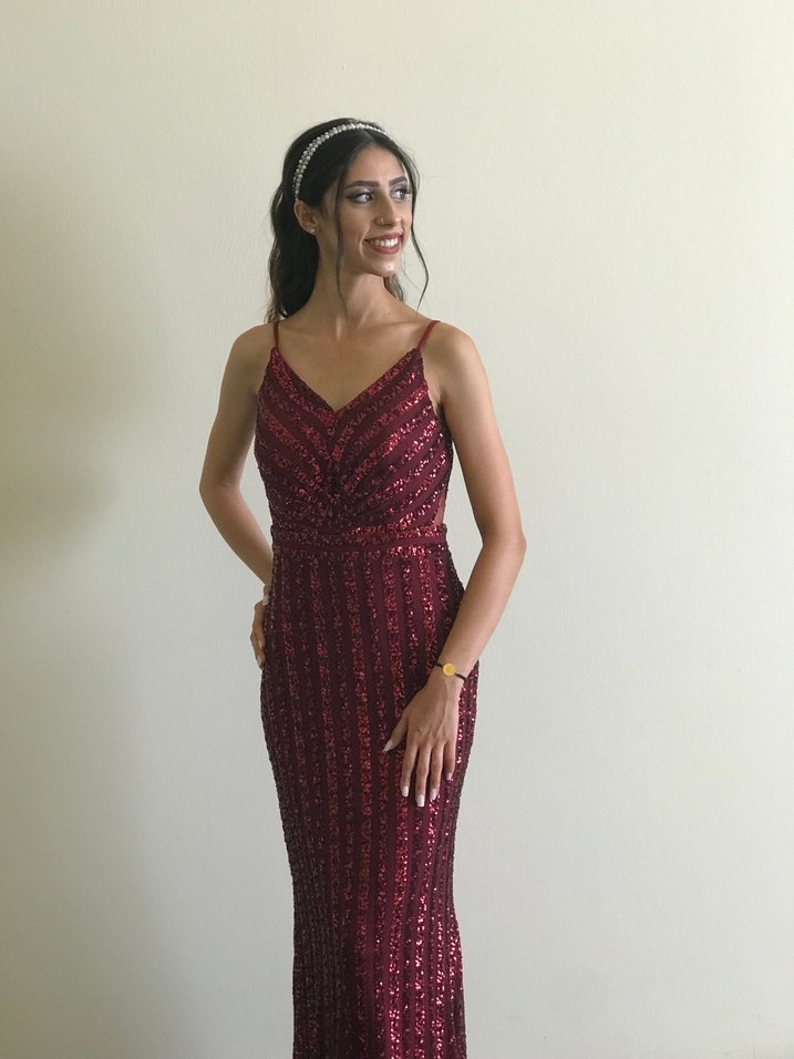 Parlak yılan desenli, drapeli V yakalı, ince askılı, klasik şıklıkta bordo uzun ve dar kesim abiye elbise. ✨