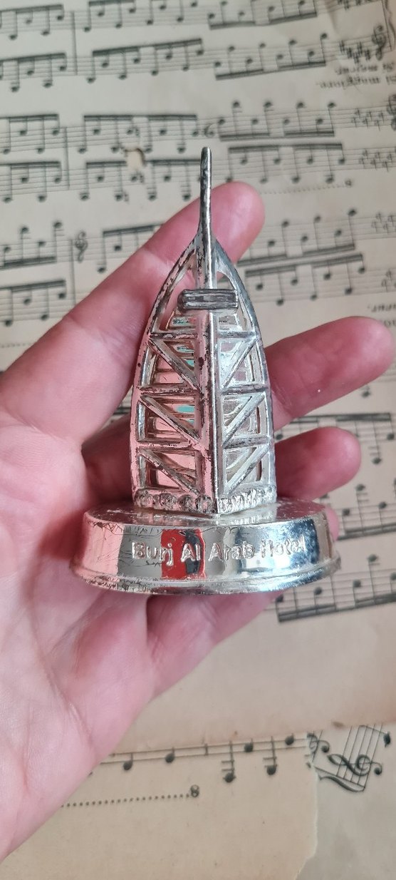 Parlak renkte, Burj Al Arab otelini temsil eden detaylı yapıya sahip metalik görünümlü figürin. Kompakt boyutta.