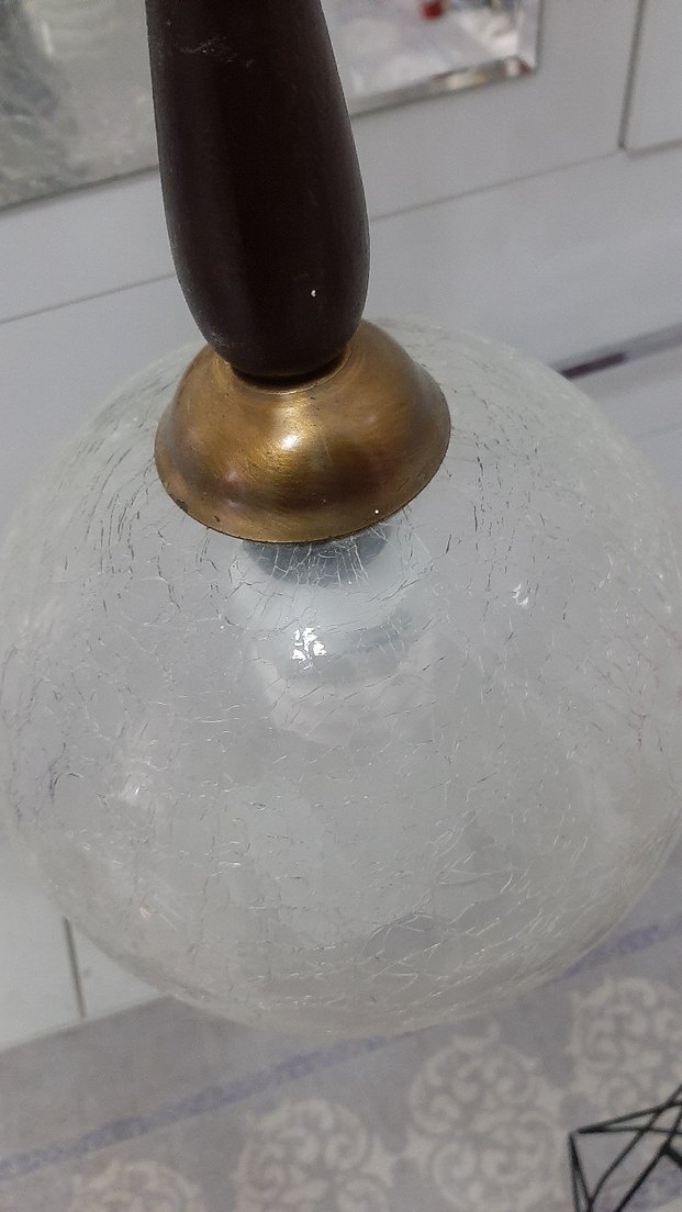 Kırık desenli camdan yapılmış bej parlak avize başlığı, pirinç renkli bağlantı ve koyu ahşap detay içerir.