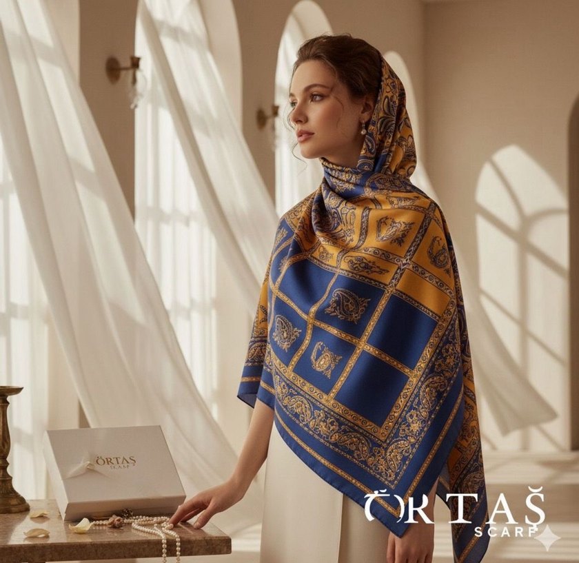 Kadın şal, parlak camel renkte, drapeli tasarım ve ipeksi kumaş ile modern klasik Paris tarzını yansıtıyor. Üzerinde 'ORTAS' yazısı bulunur.