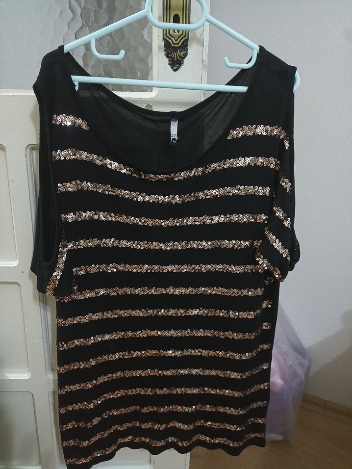 Siyah, parlak çizgili sim detaylı, salaş kesim, kolsuz ve tekne yaka kadın bluz. Sentetik kumaştan, parti ve günlük kullanıma uygun. ✨