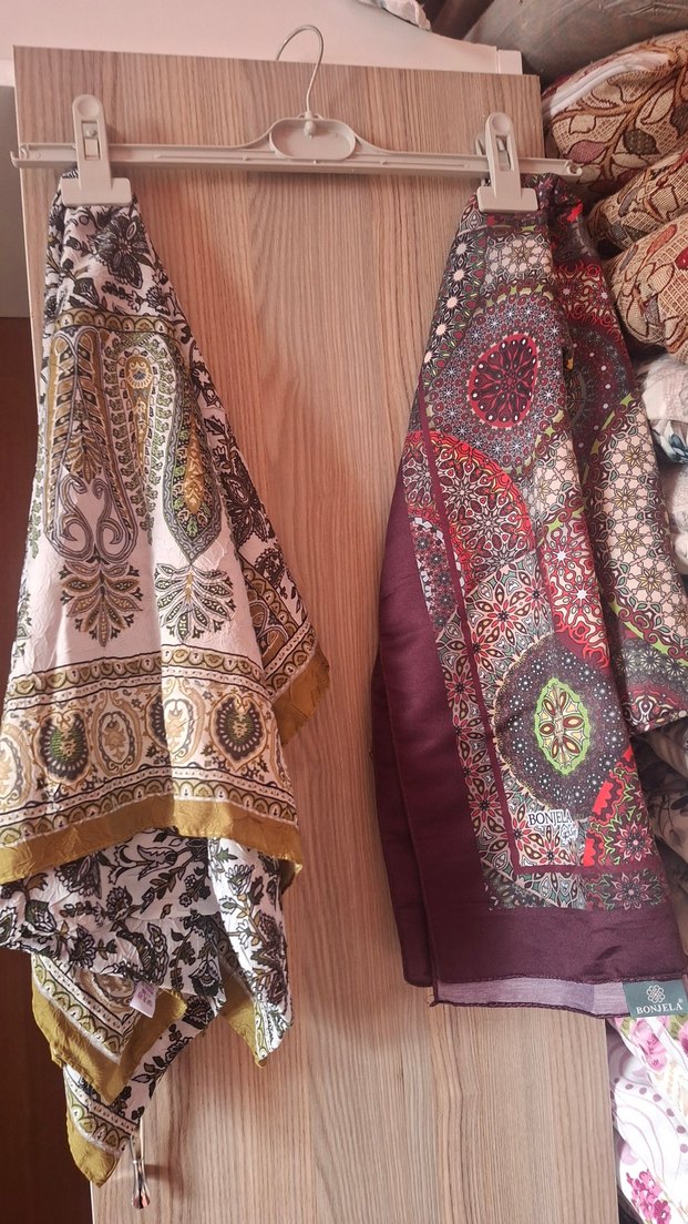 Parlak çok renkli tekstil üzerine işlemeli, bohem tarzda drapeli kadın şalı.