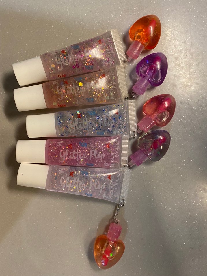 Işıltılı ve çok renkli dudak parlatıcısı seti, kalp şeklinde aplikatörlerle canlı bir parlaklık sağlar.