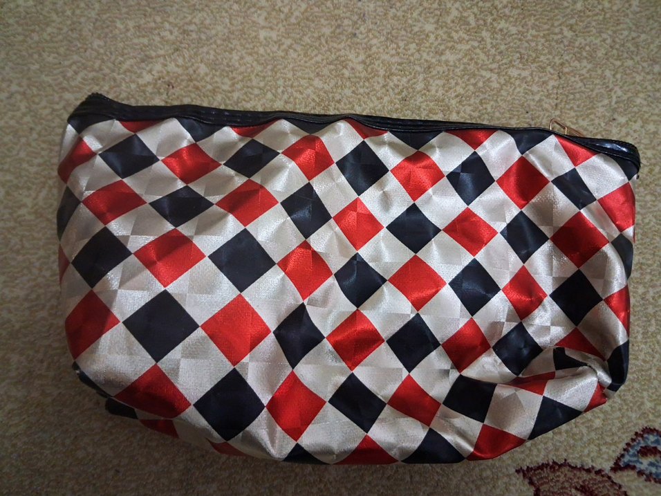Parlak, çok renkli ekoseli desene sahip makyaj çantası kırmızı, siyah ve beyaz karelerle canlı bir görünüm sunar. ️