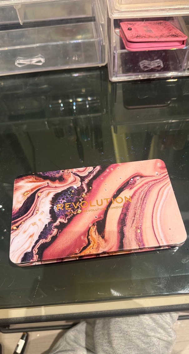 Parlak ve çok renkli göz farı paleti, mermer desenli kompakt kutuda canlı tonlar sunar.