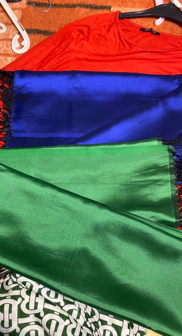 Parlak kırmızı, mavi ve yeşil renkte, saten dokulu kadın şallar, drapeli tasarımıyla bohem ve avangart tarzı yansıtır. İkisi 65 lira