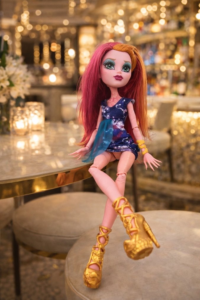 Parlak çok renkli saçlara ve detaylı makyaja sahip oyuncak bebek, koyu mavi elbise ve altın rengi topuklu ayakkabılarla tamamlanmıştır. Temiz bebektir iade yoktur❌