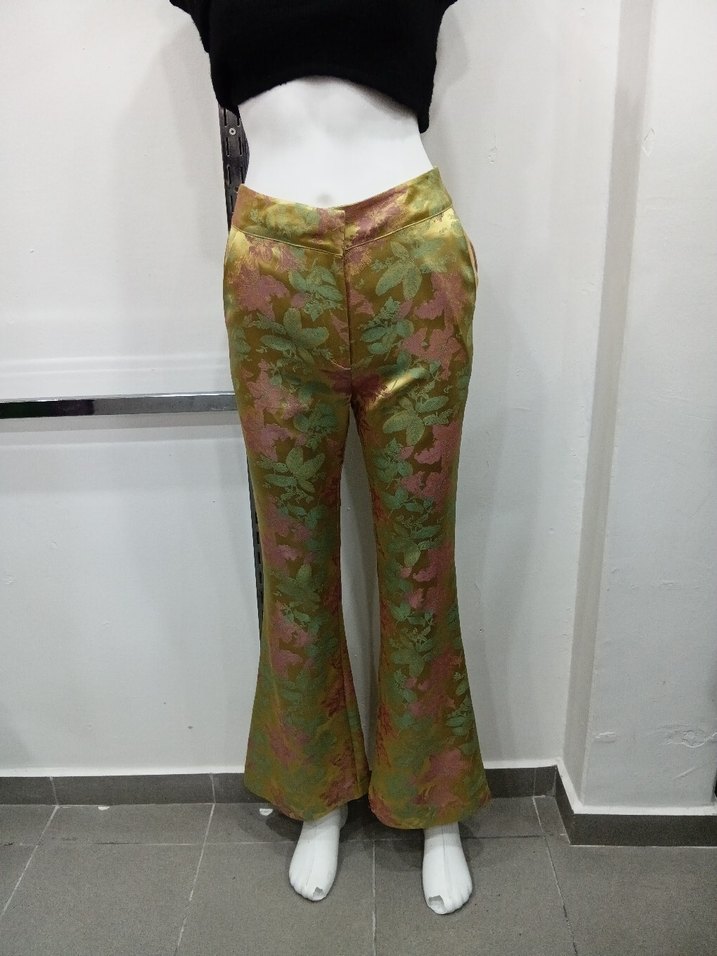Parlak çok renkli, pilili ve regular fit kadın pantolon. İpeksi kumaştan üretilmiş, bohem tarzı ve parti için uygun.