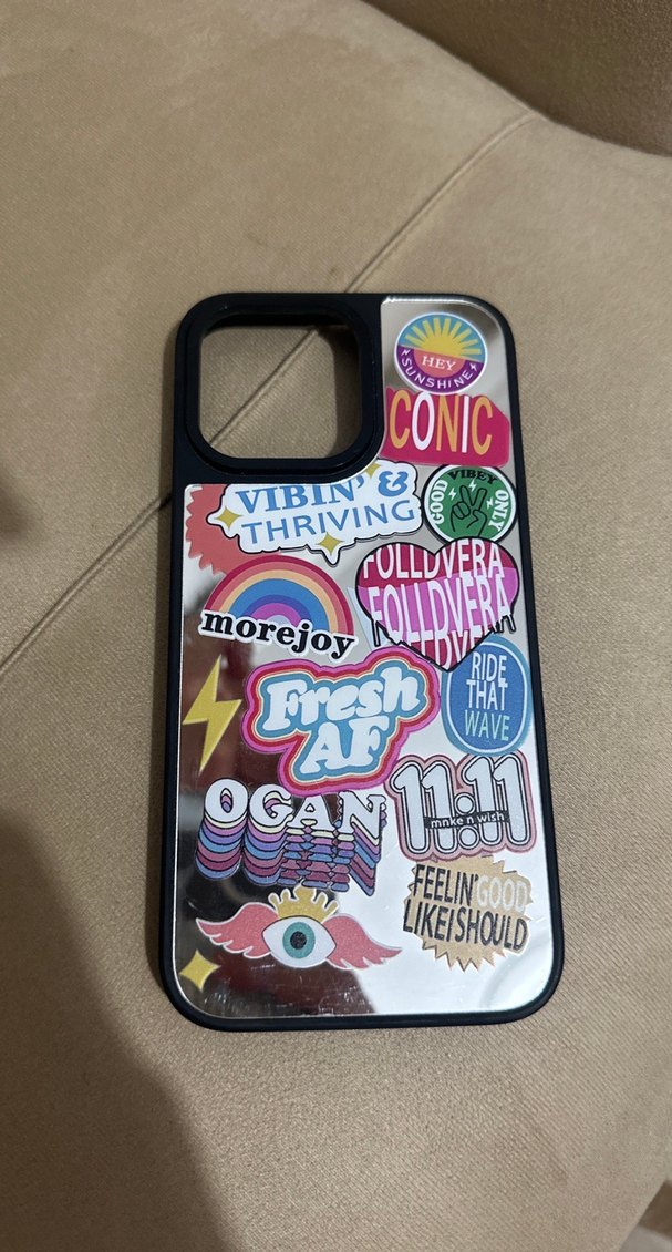 Parlak yüzeyli, koyu çok renkli pop kültür temalı telefon kılıfı, çeşitli sticker ve ifadeler içerir.