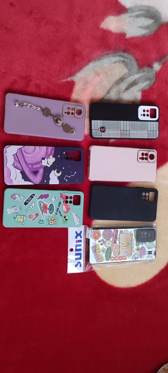 Parlak yüzeye sahip, koyu ve çok renkli pop kültür desenli telefon kılıfları. Bazılarında "XX" ve "xiuns" yazıları bulunur.