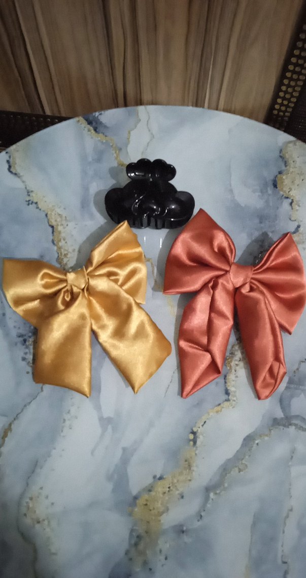 Parlak çok renkli saten fiyonklar ve siyah saç pençesi tokadan oluşan set, gösterişli bohem tarzı için uygun.