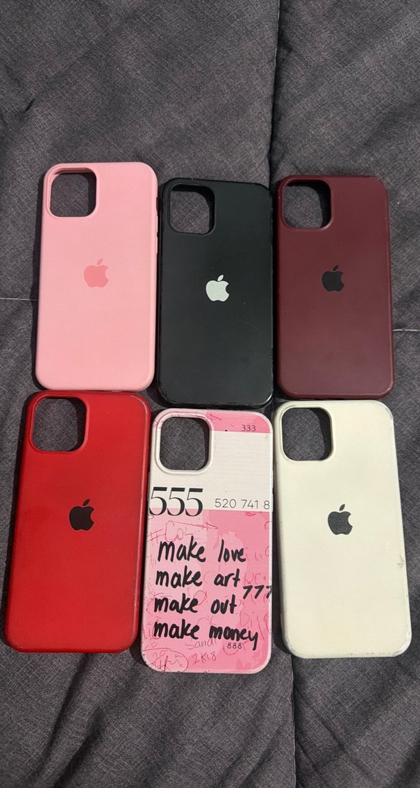 Parlak yüzeye sahip, koyu ve canlı renklerde çok renkli street wear tarzı telefon kılıfları. Üzerinde sanatsal yazılar ve Apple logosu bulunur.