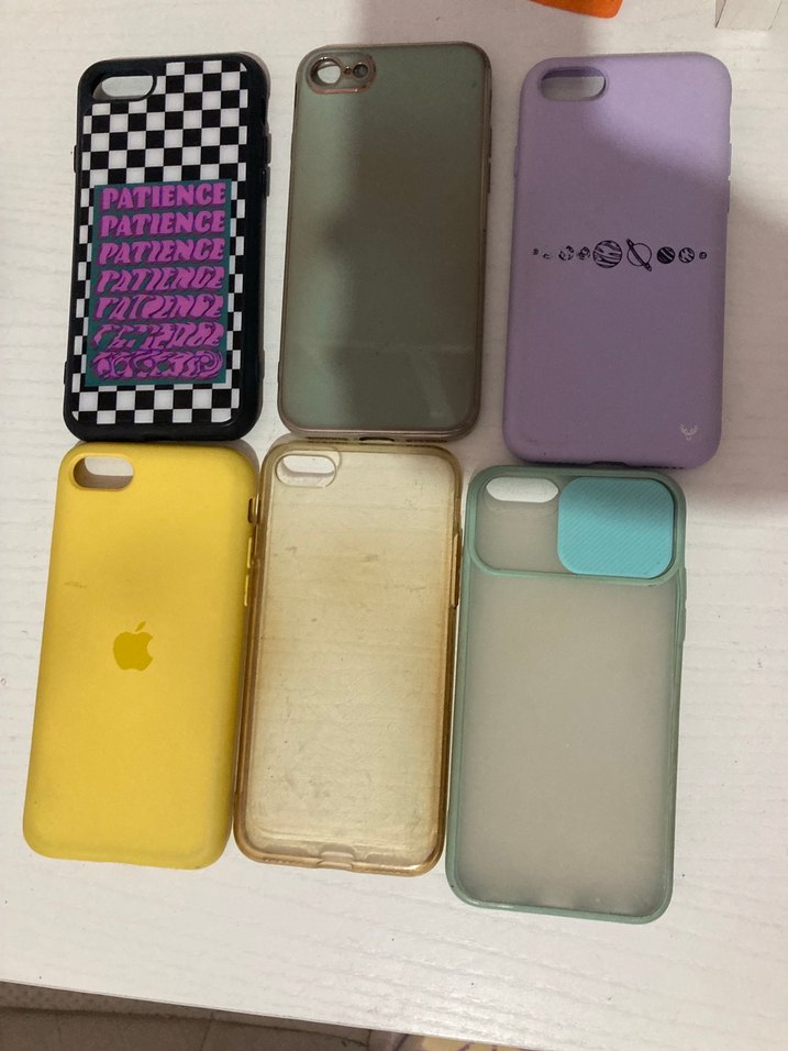 Parlak yüzeye sahip, çok renkli kareli desenli ve 'PATIENC' yazılı telefon kılıfı. Hafif tonlarda, karşı kültür tarzında. 7 8 se uyumlu