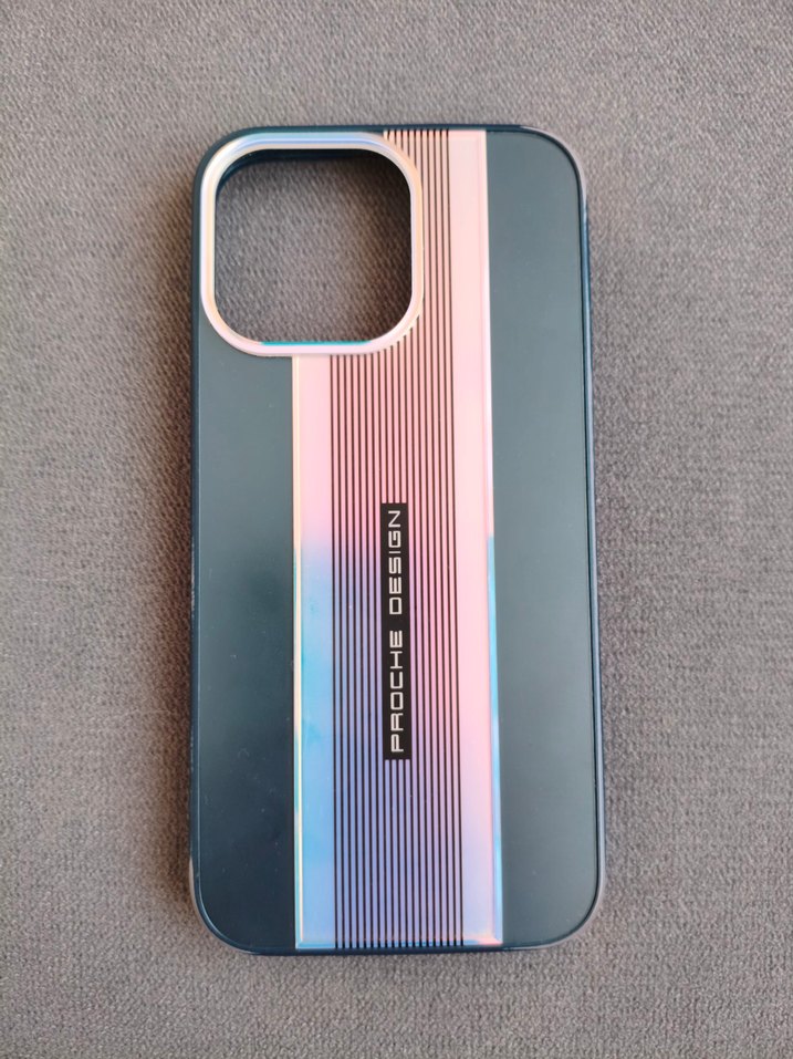 Parlak yüzeye sahip, koyu renk tabanlı ve çok renkli dikey çizgili, Procke Design imzalı modern telefon kılıfı. İPhone 15 pro Max