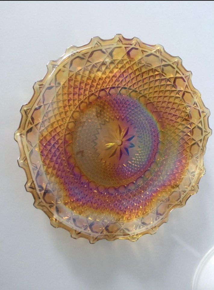 Parlak yüzeye sahip, çok renkli tie-dye desenli ve karşı kültür tarzında bir tabak.