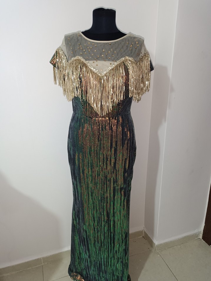Parlak çok renkli kumaştan, uzun ve bol kesim bohem elbise. Yuvarlak yaka ve kolsuz, altın püsküllerle drapelenmiş,