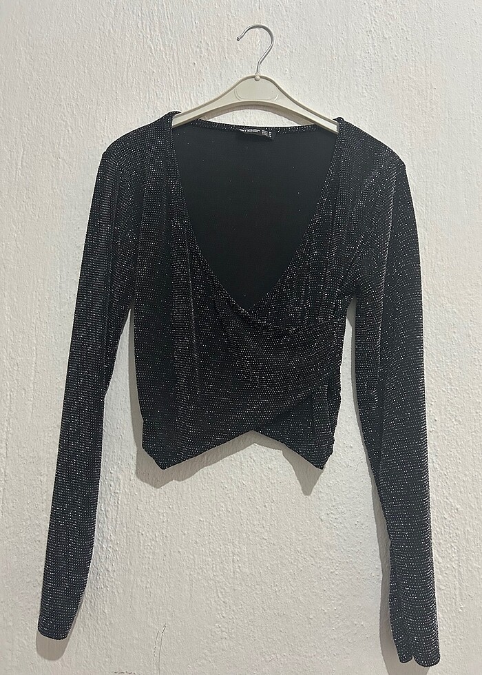 Parlak,önü çapraz detaylı,crop bluz. M beden. Sadece bir kez giyildi. Hiçbir sorunu yoktur