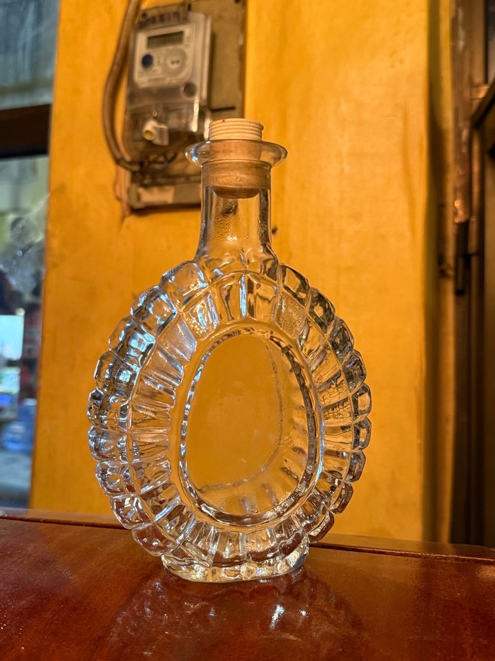 Parlak , dokulu oval tasarımlı dekoratif şişe. Mantar tıpa ve yansıtıcı yüzeye sahiptir.