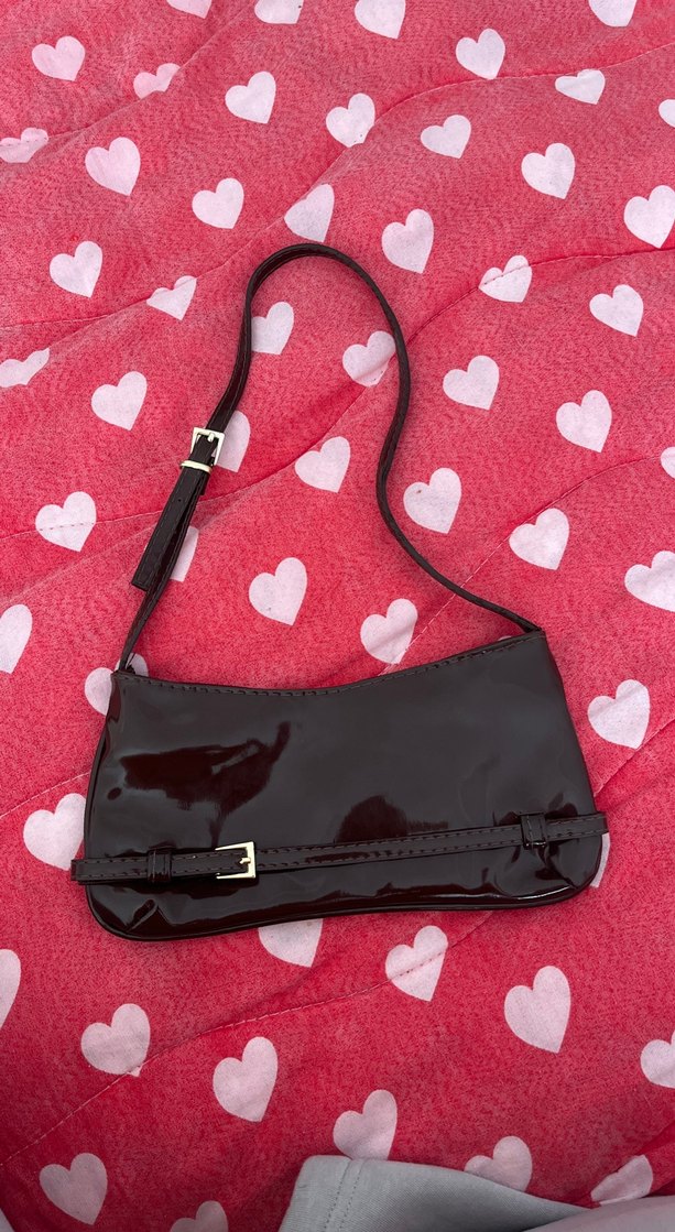 Parlak deriden yapılmış, tokalı detaylı ve ince askılı kadın çantası. Cesur gotik tarzı ve romantik akşamlar için uygun.