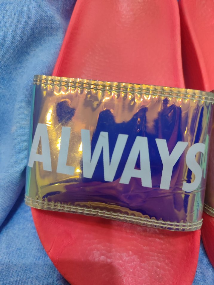 Silmeğe üşendim Parlak baskılı kayışta "ALWAYS" yazısı bulunan renkli çocuk terliği. Canlı tasarımı trend belirleyici ve avangart tarzlara uygundur.