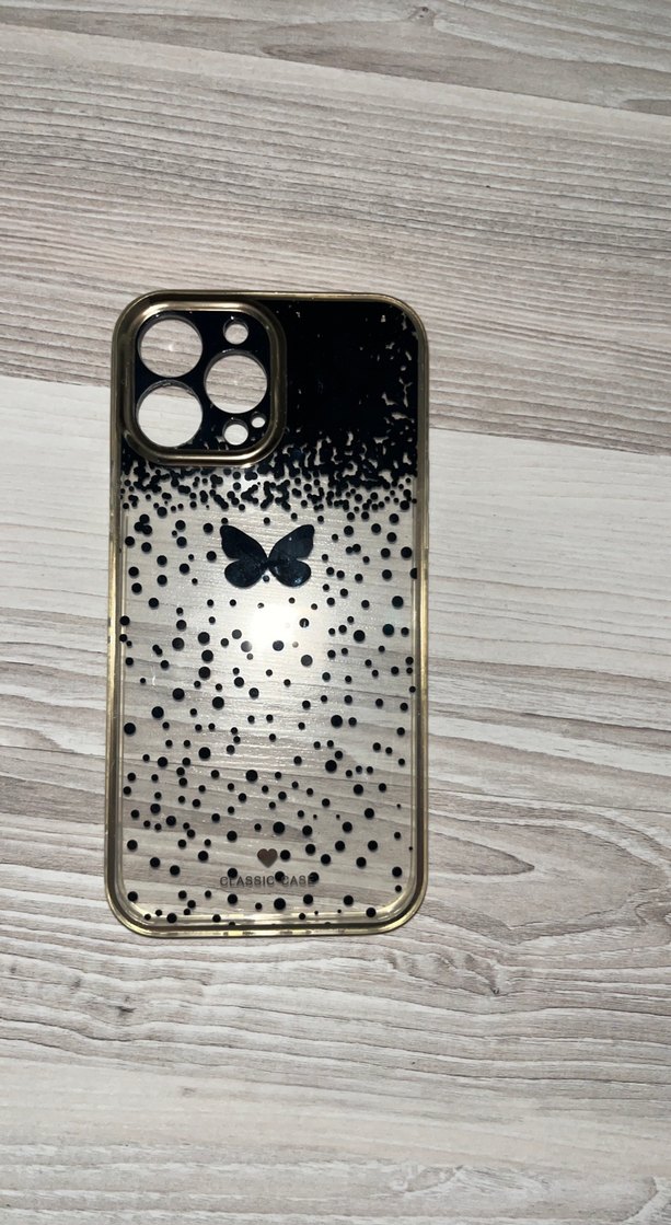 Parlak siyah yüzeye sahip kelebek ve nokta desenli bohem tarzda telefon kılıfı, cihazınızı şık şekilde korur.
