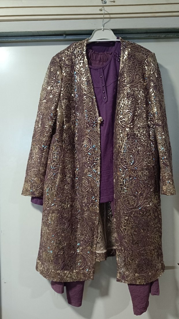 Uzun kollu, bol kesim tekstil ceket, yakasında kesik detay ve parlak desenlerle bohem tarzı ve düğünler için uygundur. ✨