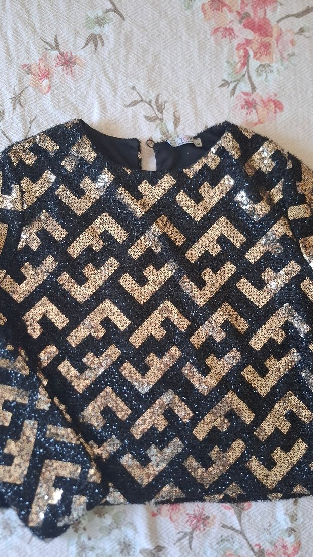Uzun kollu, yuvarlak yakalı ve bol kesim kadın bluz. Altın renkli parlak payetlerle desenli, sokak modasına uygun bir parça. ✨