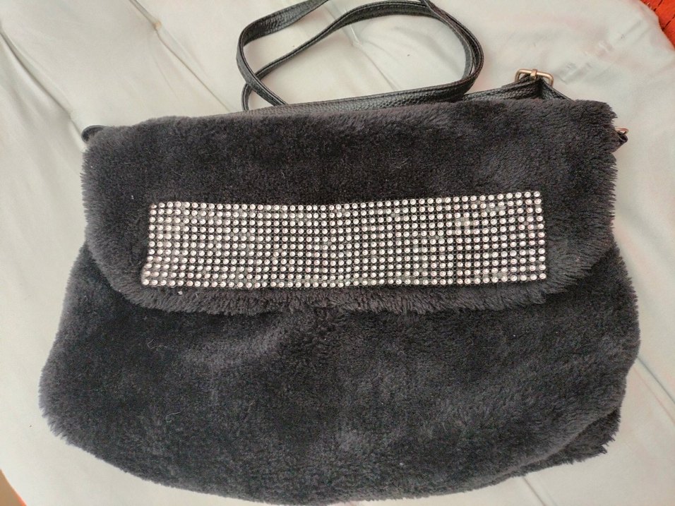 Yumuşak kürk görünümlü kumaş ve parlak işleme detaylı siyah kadın çantası, rahat ve gotik tarzları birleştirir.