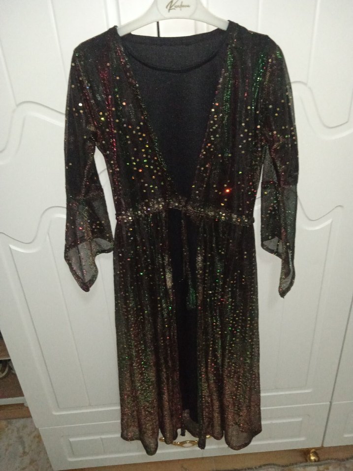 Uzun kollu, V yakalı ve bol kesim gece elbisesi. Koyu renkli batik desenli, çok renkli ışıltılı detaylara sahip, bohem ve avangart tarza uygun. ✨