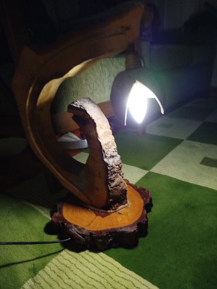 Parlak deve rengi doğal ahşap lamba, ışığı yanmaktadır. rustik ve şık bir görünüm sunar.