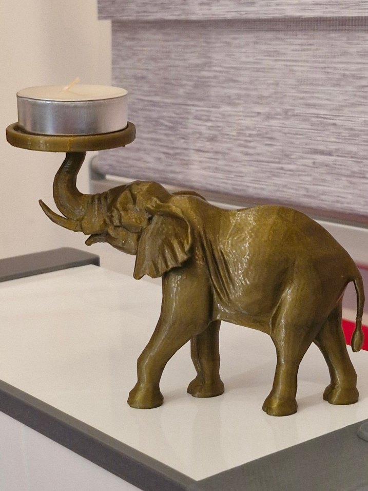 Yaklaşık 13 cm yüksekliğinde, küçük bir tealight mum tutan parlak deve renkli fil biblo.İstenilen sayıda yapılır.