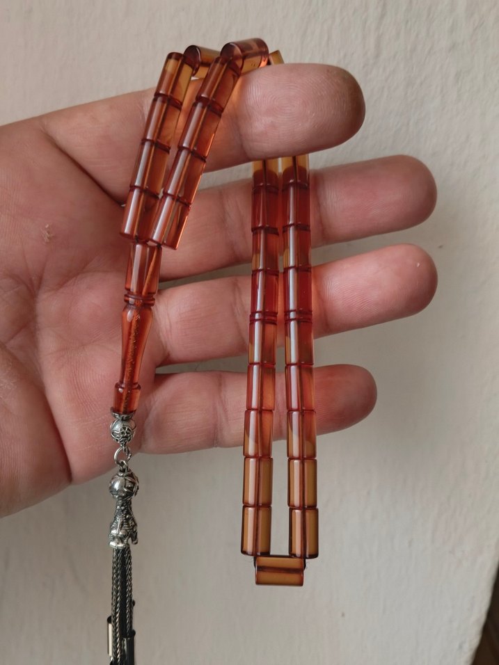 Parlak deve tüyü renginde, konvansiyonel stilde ve bohem tarzda erkek tesbih. Dikdörtgen boncuklar ve metal püskül bulunur.