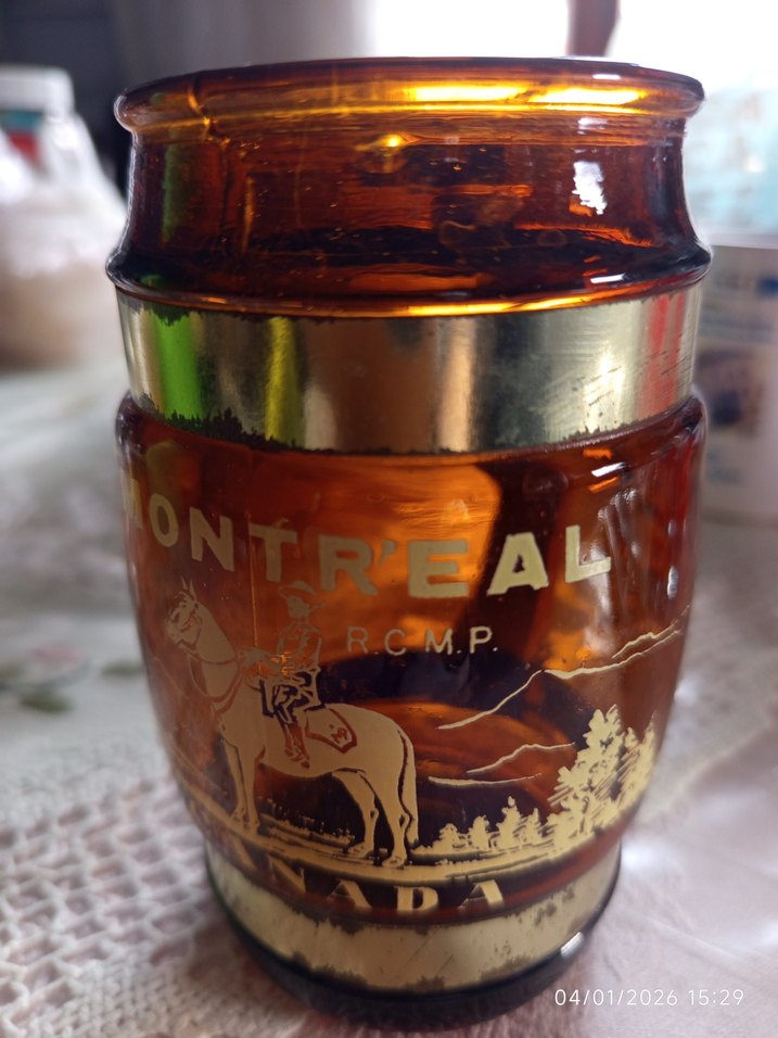 Parlak deve tüyü renginde, Montreal temalı, at ve binici figürlü bir vazo. Üzerinde R.C.M.P. yazısı ve altın renkli şerit bulunur. Vintage tarzda detaylı grafiklere sahip.
