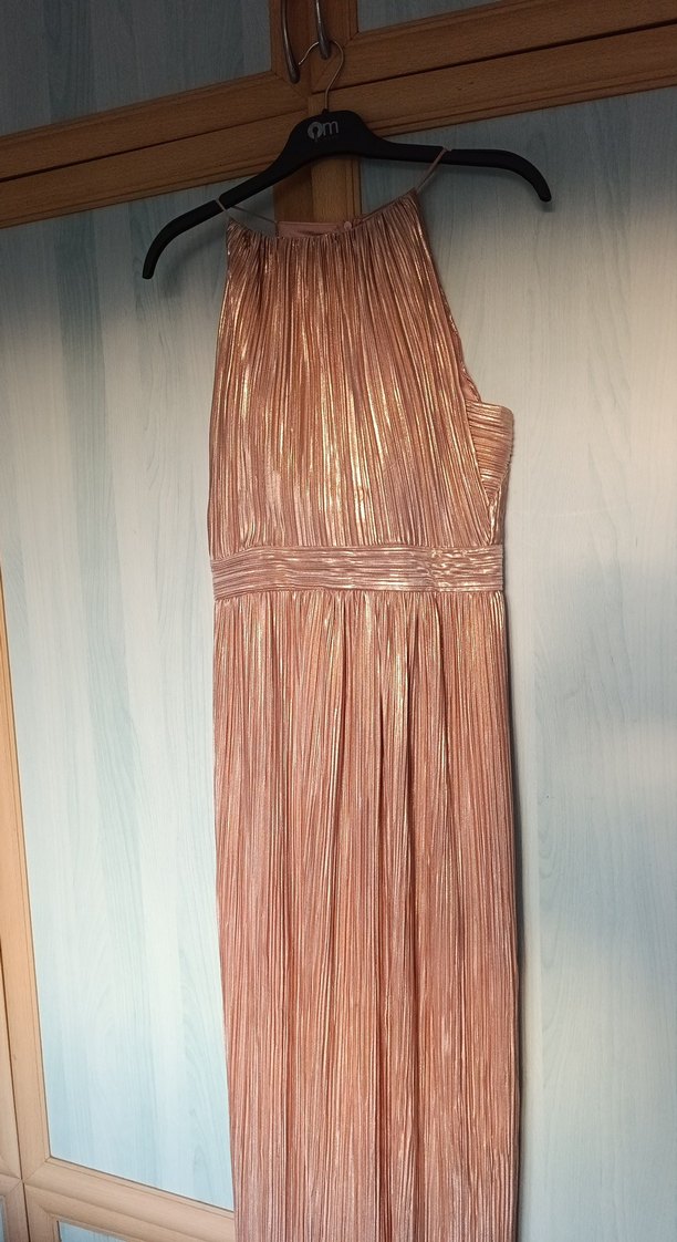 Parlak dore,kendinden pileli kumaştan,, uzun boy abiye elbise. Bohem ve şık tarzıyla partiler ve özel günler için ideal. ✨kendi içinde astarlı ve balenli..