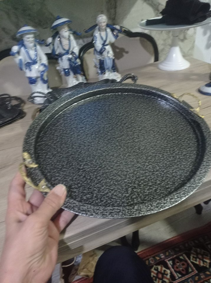 Kulplu, parlak eskitme yuvarlak tepsi, sunum veya dekorasyon için uygun. Dokulu yüzeyi ile dikkat çekiyor.