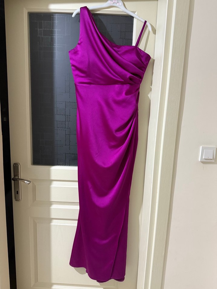 Parlak fuşya tek omuz Uzun Abiye Elbise