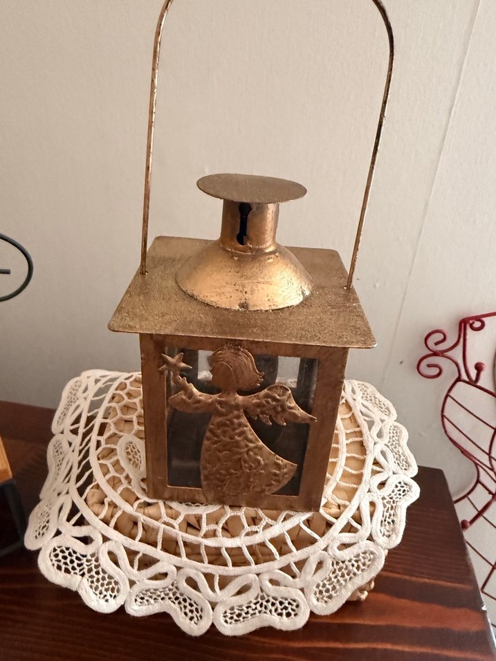 Parlak Golf renginde, yanlarında melek figürü bulunan, taşınabilir saplı kare şekilli mumluk. Vintage tarzda şık bir dekorasyon ürünü. ️