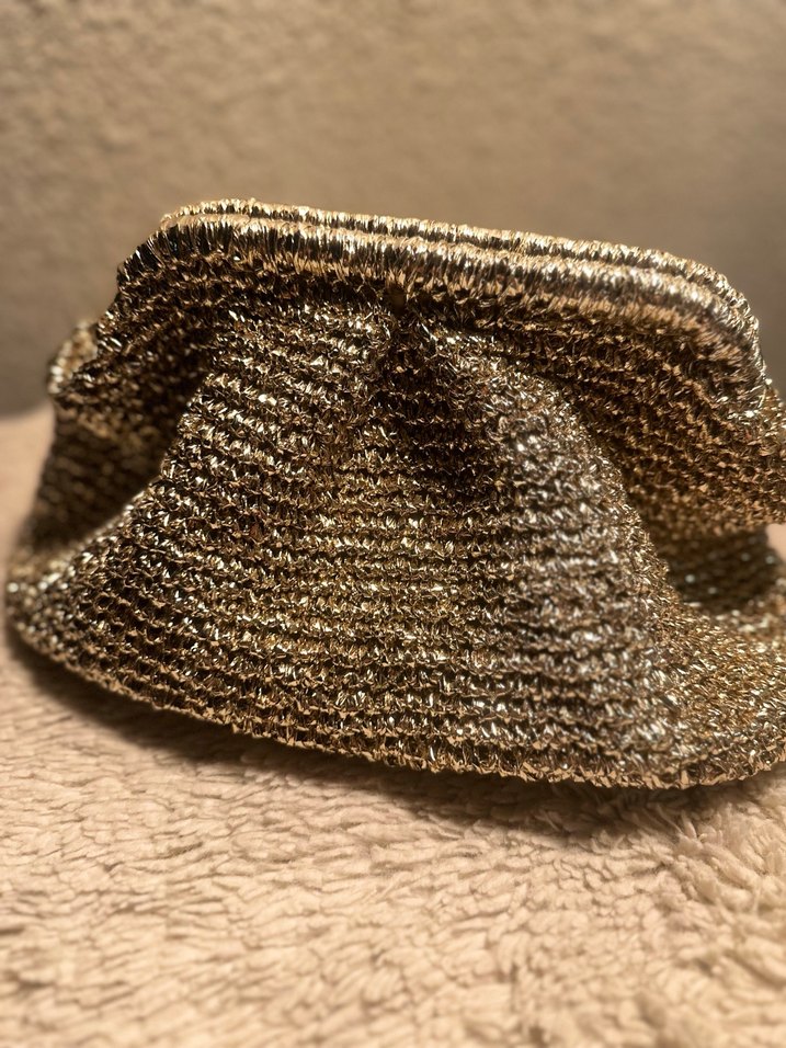 Parlak gold örgü dokusuyla bohem tarzda kadın portföy çanta, trend ve avant-garde görünüm için uygun. Rahat örgü kumaşı günlük kullanım için ideal.