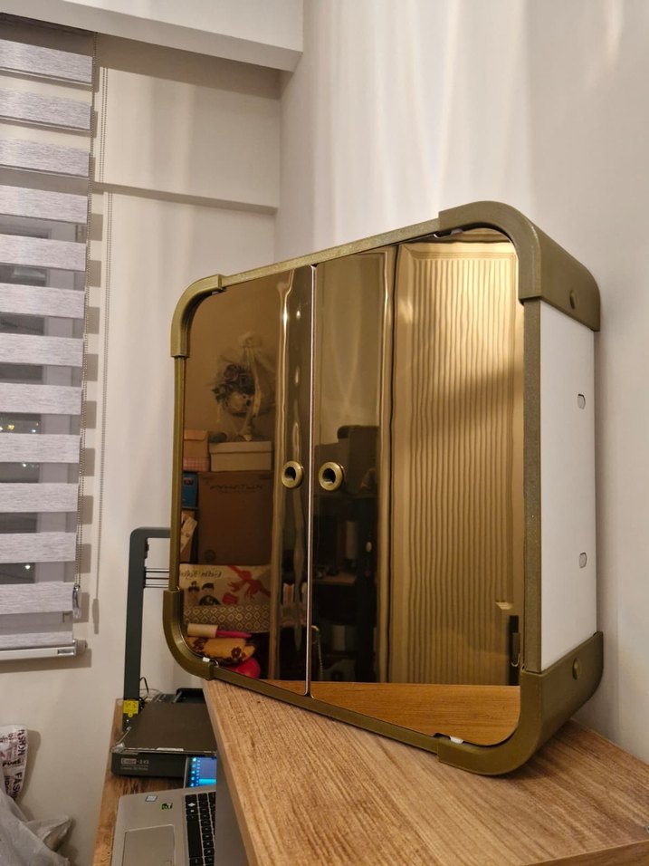 Parlak altın renkli, yuvarlak köşeli dikdörtge mdf dolap.İster hareketli ister sabitlenebilir özellikte.