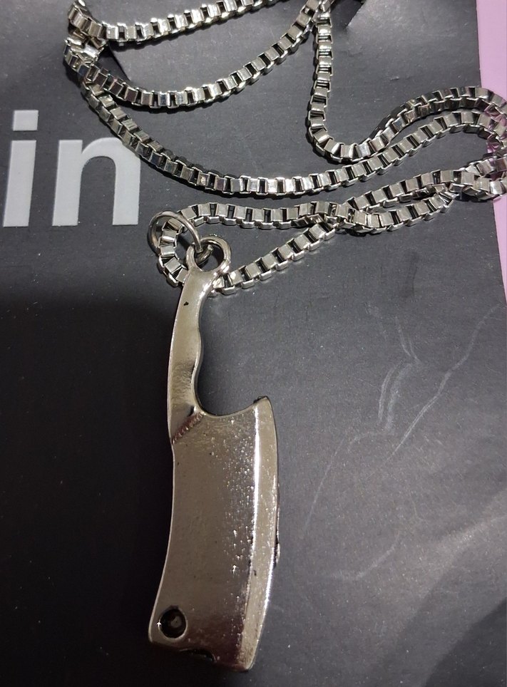 Parlak gri renkte, bıçak figürlü erkek kolye, grunge punk ve rock tarzını yansıtıyor. Zinciri cesur stil ile uyumlu.