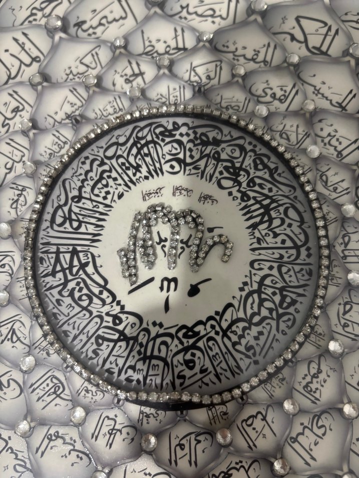 Parlak gri renkte, Arapça hat sanatıyla süslenmiş, küçük boncuk detaylarıyla bohem ve sade bir erkek rozeti. ✨