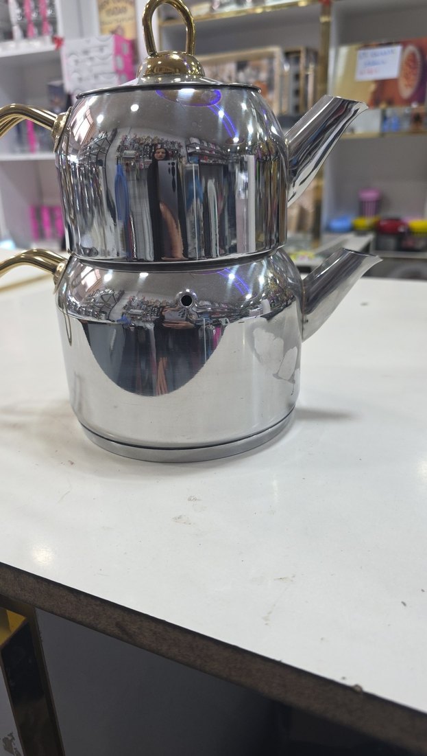 Parlak gri çelikten yapılmış, üst üste yerleştirilen ve kıvrımlı ağızlı, metal saplı çaydanlık seti.