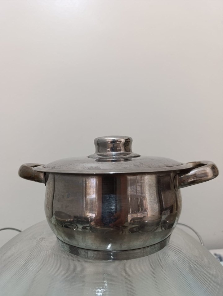 Saplı ve kapaklı, parlak gri çelik tencere.