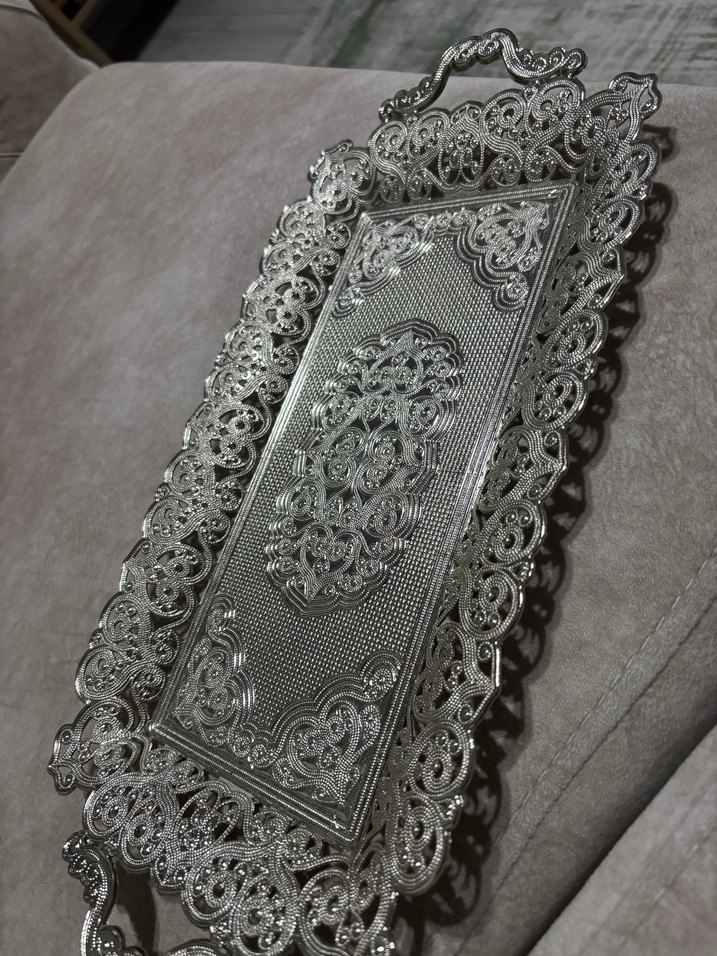 Parlak gri renkte, iki kulplu, detaylı desenlere sahip metal tepsi. Sunum veya dekorasyon için uygundur. ️