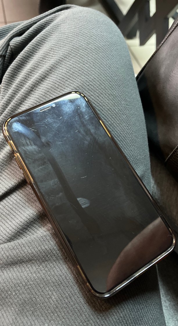 Parlak gri renkte, yansıtıcı ekranlı iPhone. Ekranda bazı leke ve parmak izleri bulunuyor. Telefon dokulu bir kumaş yüzeyin üzerinde duruyor.