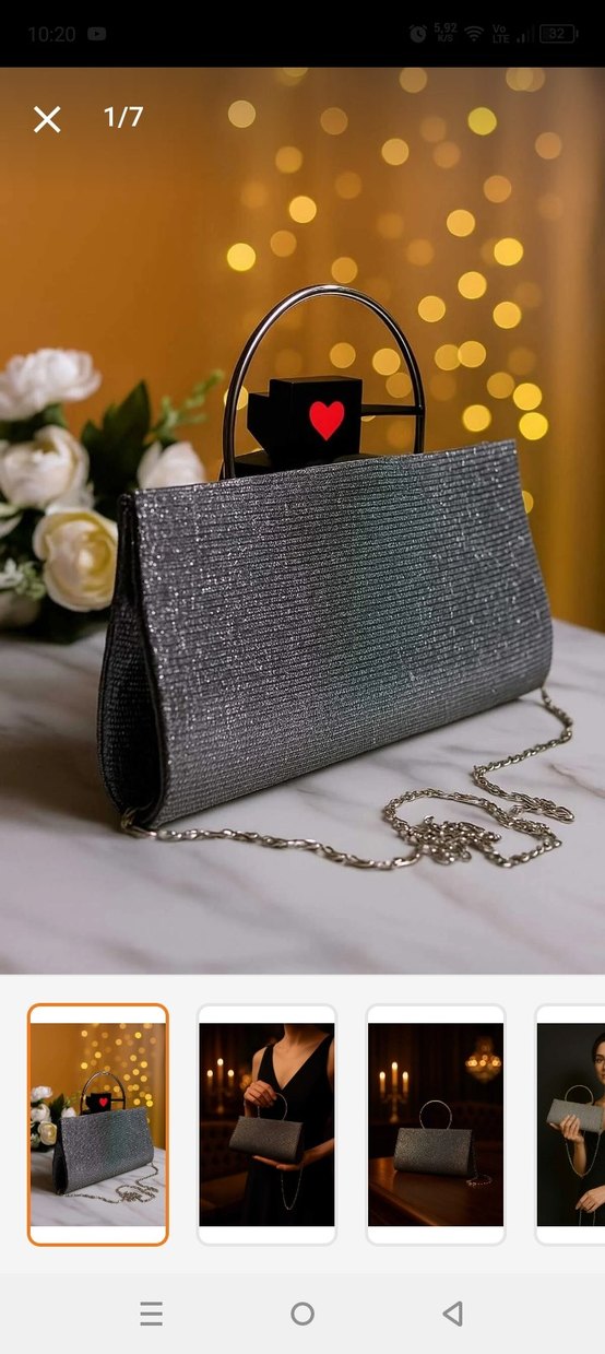 Parlak gri sentetik kumaştan, işlemeli ve payetli kadın portföy çanta. Metal saplı ve zincir askılı, romantik akşamlar için uygun. ✨